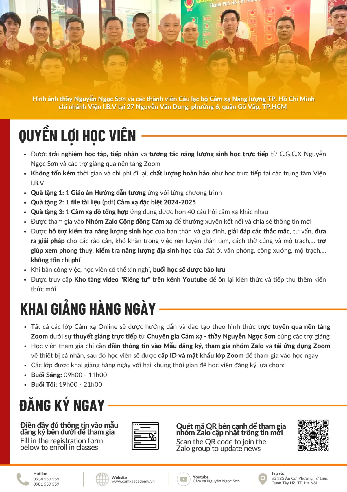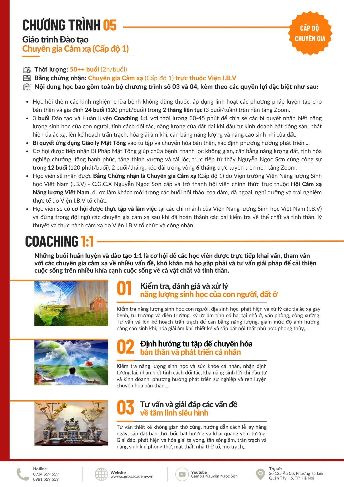 Câu trả lời: Các Chương trình học Cảm xạ đều được hướng dẫn và đào tạo trực tuyến qua nền tảng Zoom. Học viên hoàn toàn có thể nâng cấp lên các khóa huấn luyện chuyên sâu hơn mà không mất phí khi đã tham gia Chương trình 1, 3, 4. Hãy liên hệ đến số hotline để được nâng cấp khóa học của mình nhé.
